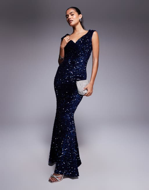 Goddiva Multi sequin & velvet bardot maxi dress in navy