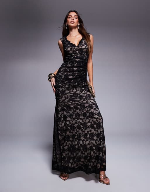 Goddiva Off the shoulder scalloped neck maxi dress in black