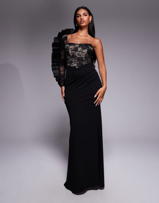 Goddiva One shoulder organza fan detail lace bodice maxi dress in black