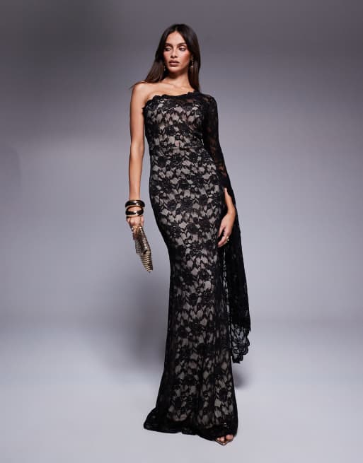 Goddiva One shoulder scalloped neck maxi dress in black