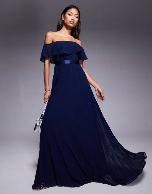 Goddiva Pleated chiffon off shoulder maxi dress in navy