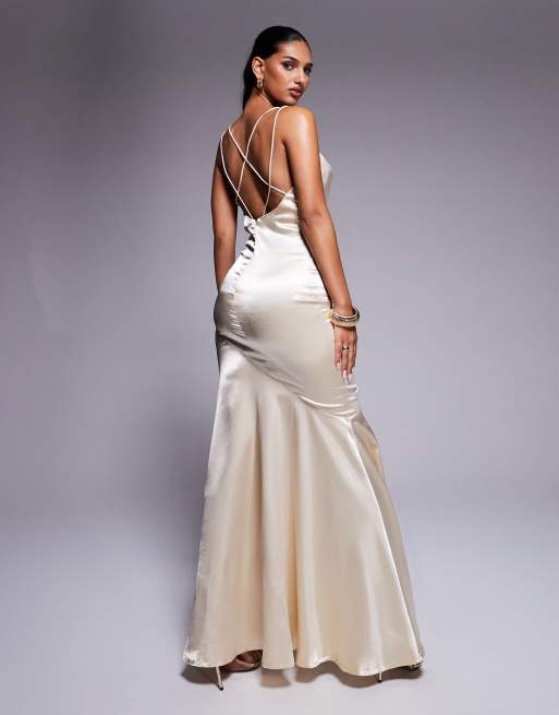 Goddiva Satin cowl neck with strappy back maxi in champagne