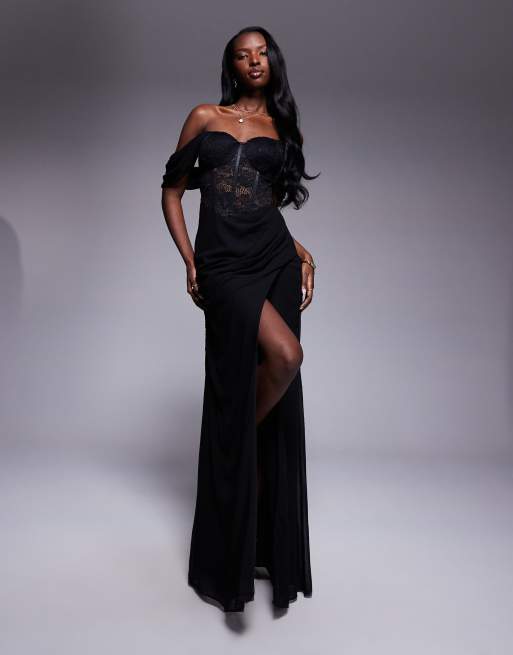Goddiva Scalloped lace & chiffon winged corset bodice maxi dress in black