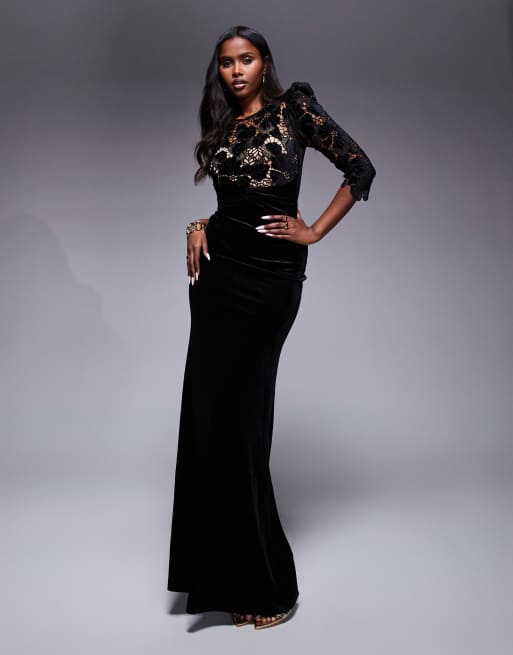 Goddiva Scalloped velvet crochet maxi dress in black