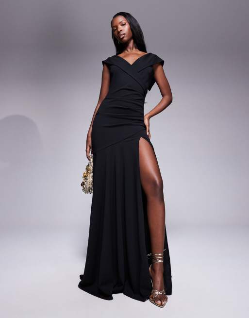 Goddiva scuba crepe off shoulder front split maxi dress in black