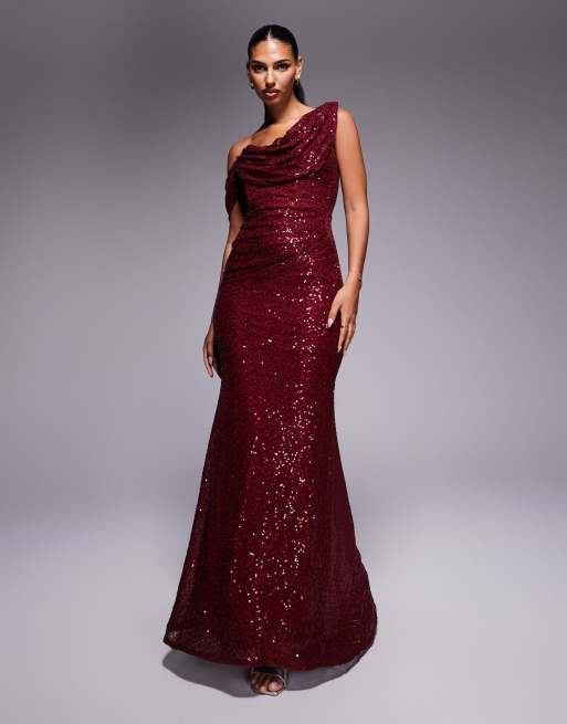 Goddiva Sequin cowl one shoulder maxi dress in wine
