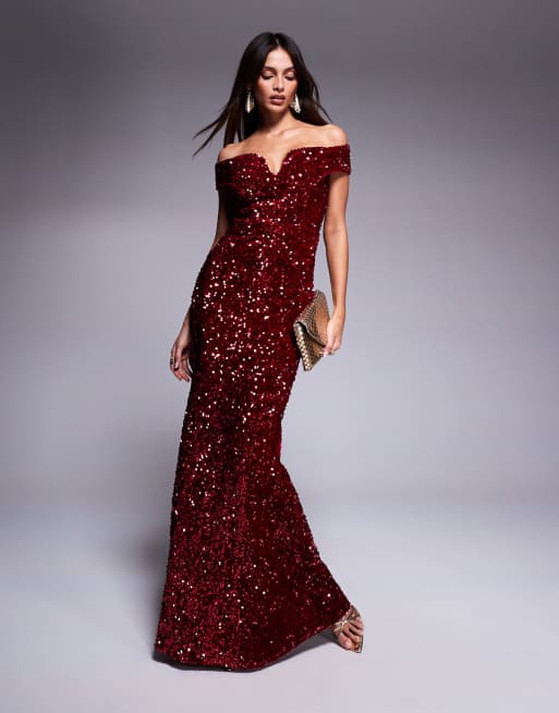 Goddiva Sequin velvet bardot evening maxi dress in red