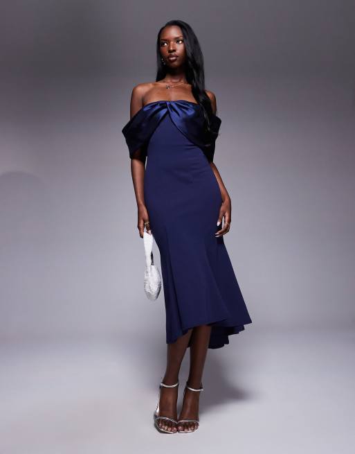 Goddiva Twist knot satin & scuba bardot high low midi dress in navy