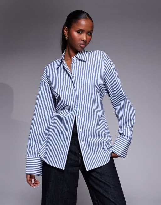 Good American oversized adjustable waist poplin shirt in blue stripe