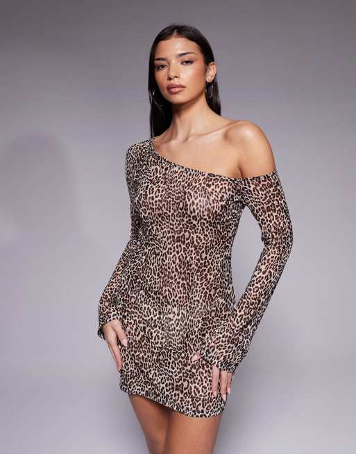 Good American print mesh asymmetric long sleeve mini dress in leopard
