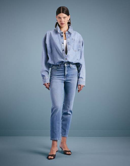 - Stretch denim: mid-blue wash