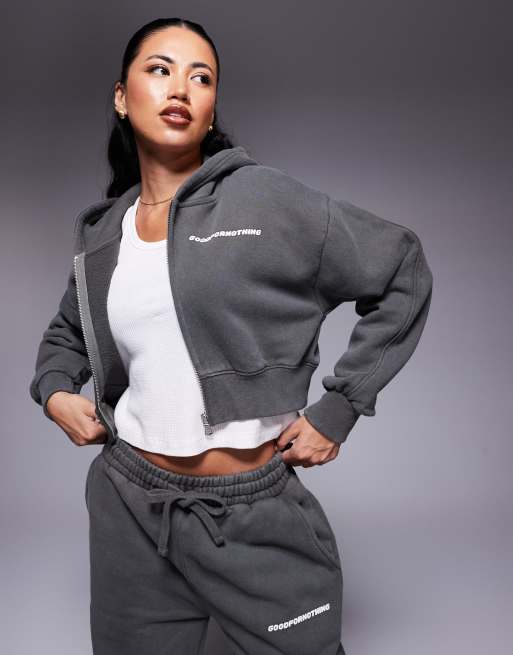Good For Nothing Cropped zip through hoodie in grey