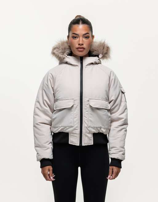 Good For Nothing Padded parka jacket with faux fur trim hood in stone