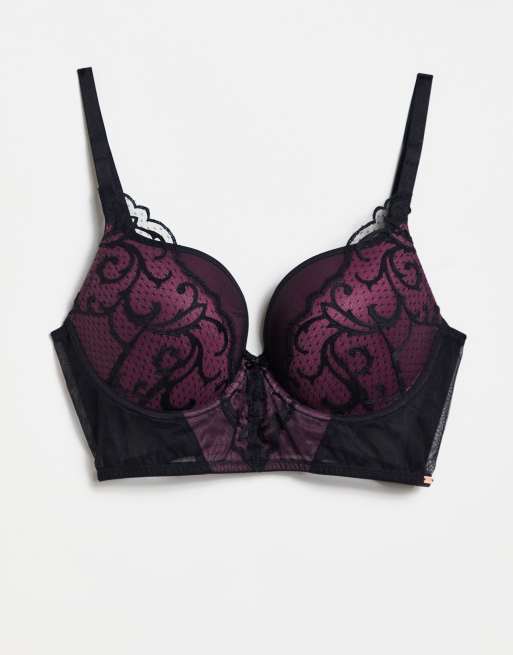 Gossard VIP Indulgence padded underwired longline bra with lace trim in black and burgundy