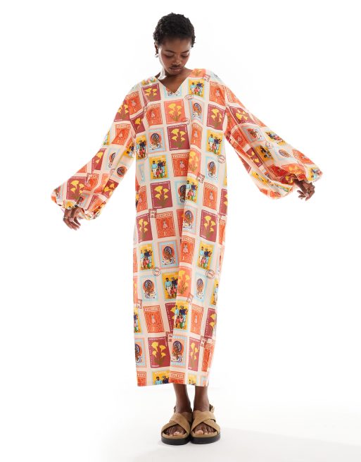 Heathe Allen balloon sleeve midi dress in brown postcard print
