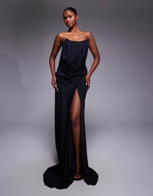 Heiress Beverly Hills structured bandeau drape detail thigh split maxi dress in black