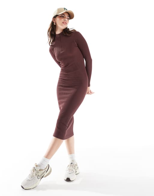 Hera Womens ribbed base long sleeve midi dress in mahogany brown