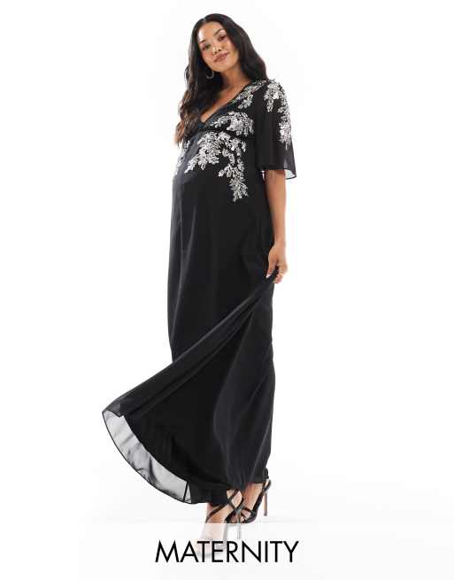 Hope & Ivy Maternity flutter sleeve embellished maxi dress in black