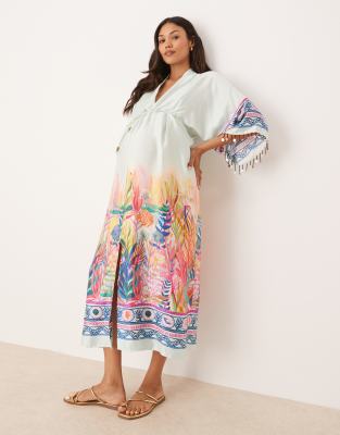 Hope & Ivy Maternity tie waist kimono wrap midi dress in blue scenic print