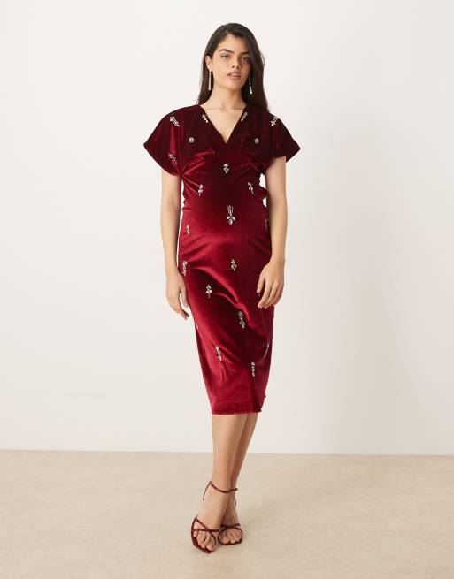 Hope & Ivy Maternity v-neck embellished velvet midi dress in burgundy