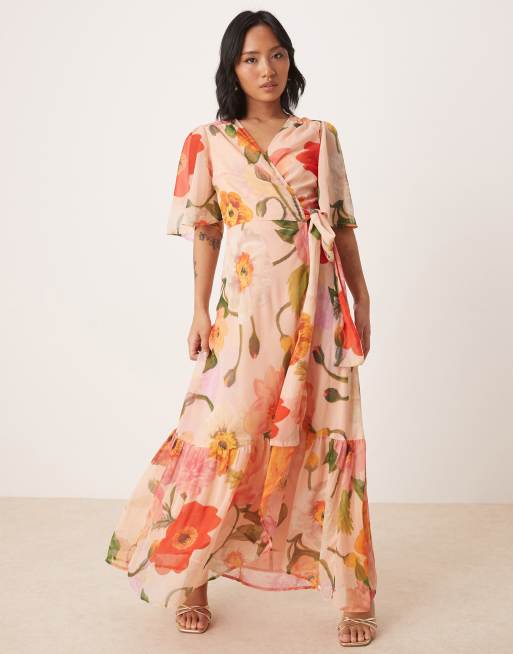 Hope & Ivy Petite frill sleeve maxi wrap dress with tie waist in pink floral
