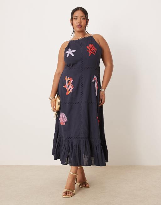Hope & Ivy Plus beach embellished high neck midi dress in navy