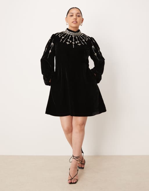 Hope & Ivy Plus embellished high neck velvet mini dress in black