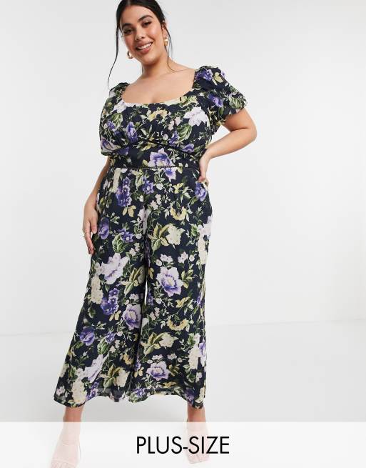 Hope & Ivy Plus puff sleeve wide leg jumpsuit in navy based floral