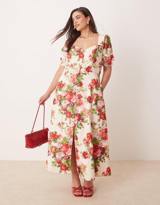 Hope & Ivy Plus square neck open back midi dress in white red floral