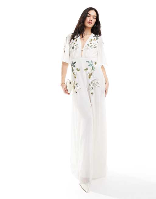 Hope & Ivy Bridal flutter sleeve embroidered floral maxi dress in ivory