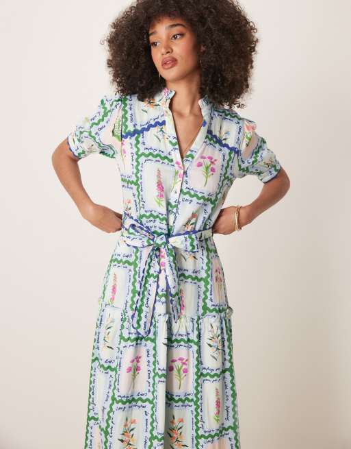 Hope & Ivy button front midi dress with tiered skirt and tie waist in multi