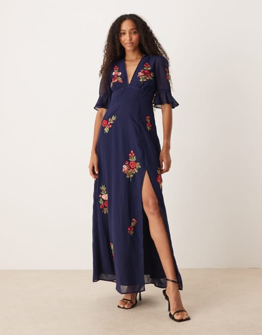 Hope & Ivy embroidered v-neck maxi dress with open back in navy