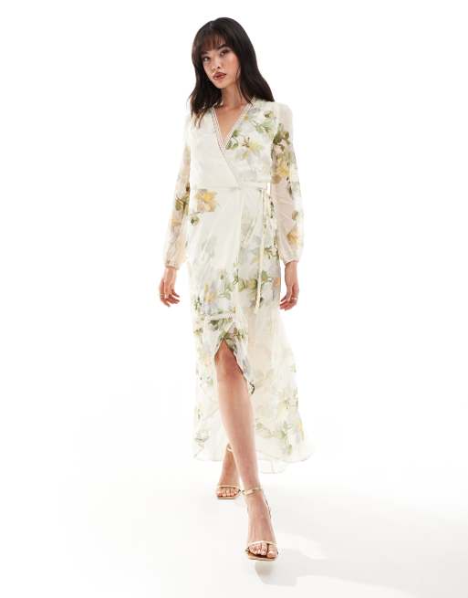 Hope & Ivy fluted sleeve wrap maxi dress with tiered hem in white