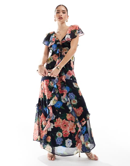 Hope & Ivy frill maxi dress with lace trims and keyhole detail in navy floral