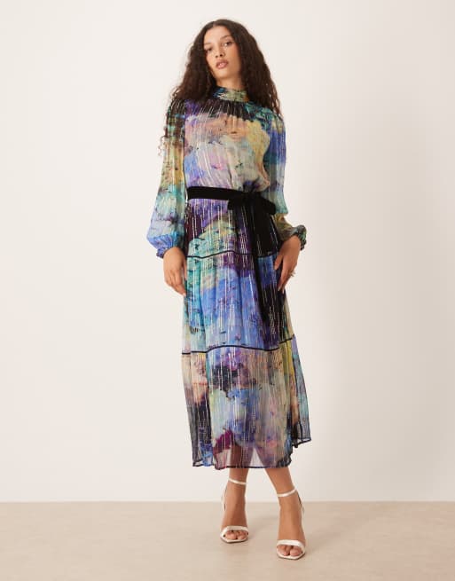 Hope & Ivy high neck maxi dress with tie waist in blue print