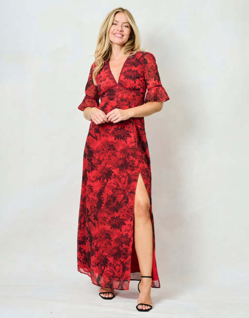 Hope & Ivy The aaliyah frill sleeve thigh split open back maxi dress with lace trim in red multi