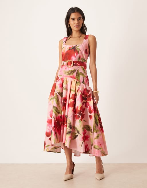 Hope & Ivy The sybil square neck drop hem midaxi dress with waist belt in pink