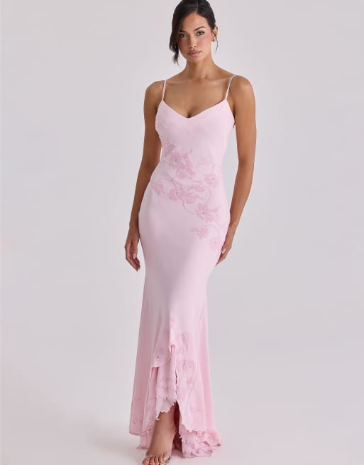 House of CB Anastelle pink hand beaded embellished satin maxi dress in pink