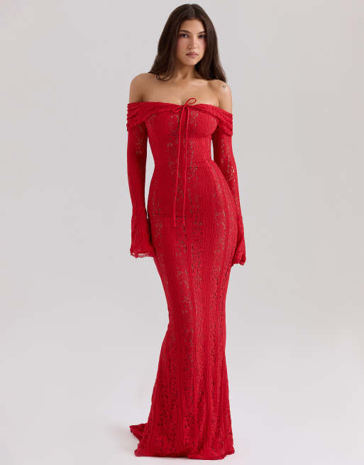 House of CB Belle off shoulder floral lace maxi dress in red