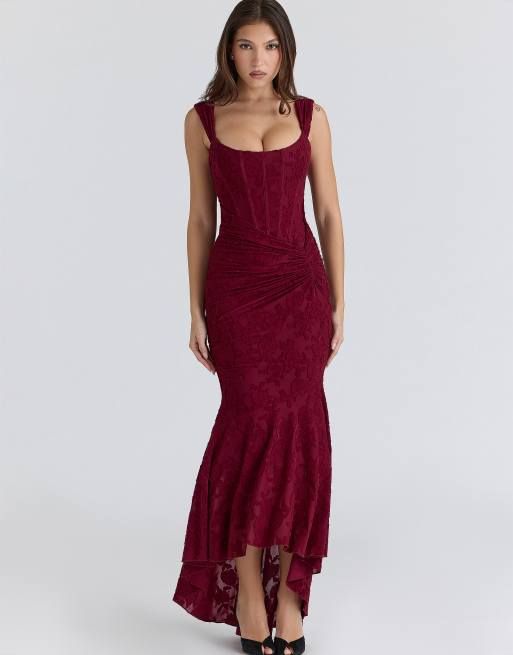 House of CB Cesca wine floral lace corset maxi dress in wine