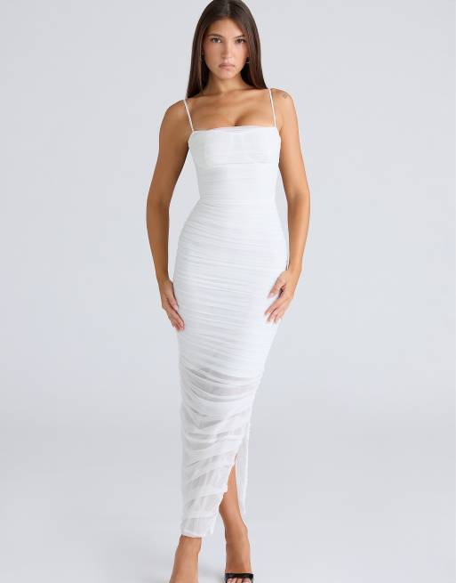 House of CB Fornarina white gathered stretch mesh midi dress in white