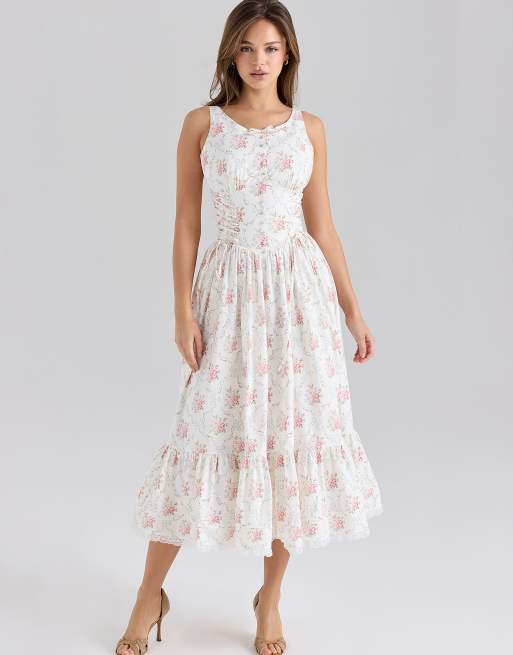 House of CB Sienna stretch cotton lace up midi dress in rose print
