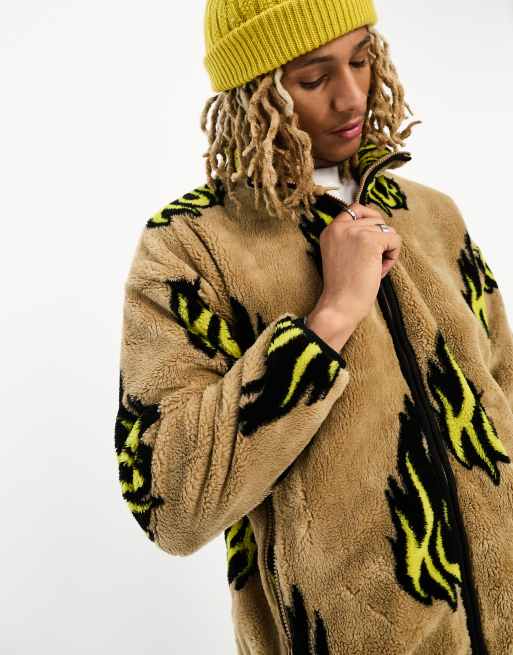 HUF flamin sherpa jacket in light brown with all over flamed logo print