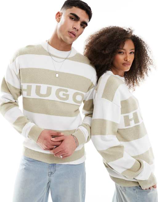 HUGO BLUE unisex logo knitted jumper in beige stripe