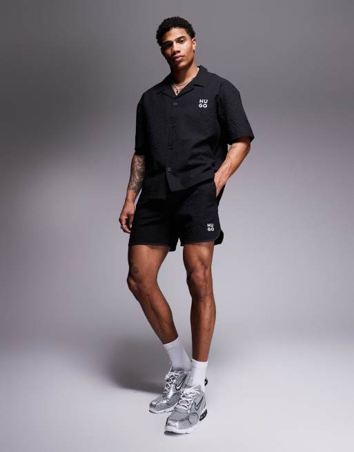 Hugo Red Chaffle logo waffle swim shorts in black co-ord