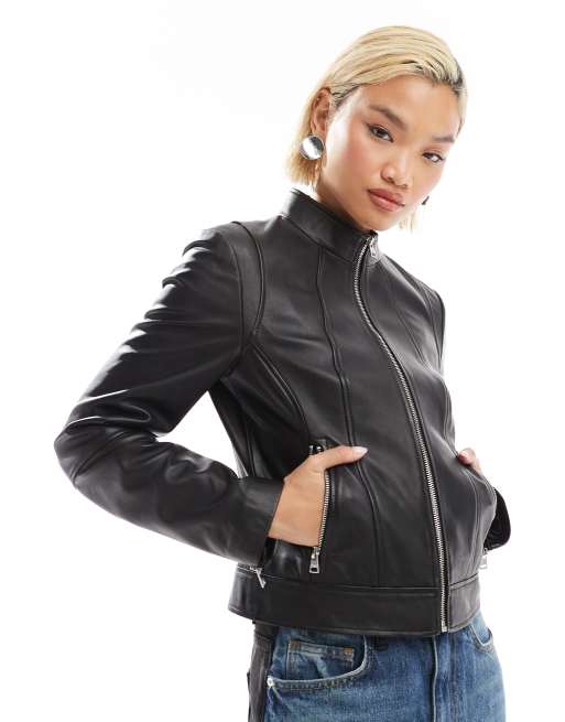 HUGO Red leather moto jacket in black