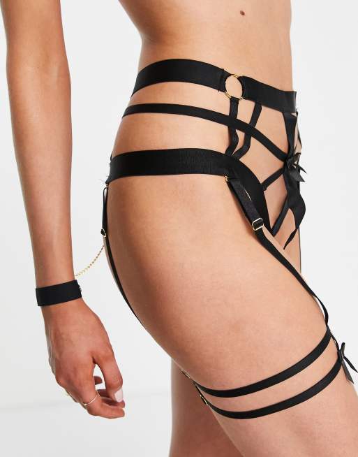 Hunkemoller Minx high waist strappy thong with suspender detail and detachable cuffs in black