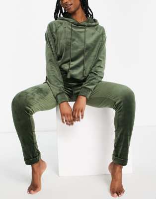 Hunkemoller Velour turn up cuff joggers with tassel detail in khaki