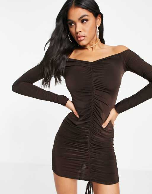 I Saw It First ruched bardot mini dress in brown