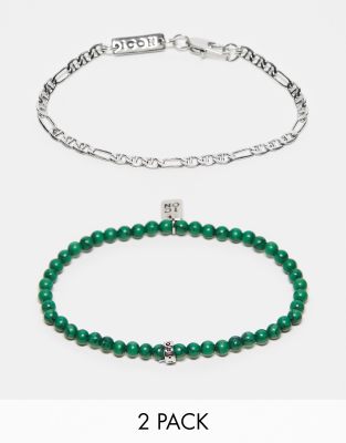 Icon Brand bead and chain bracelet 2 pack in silver and green